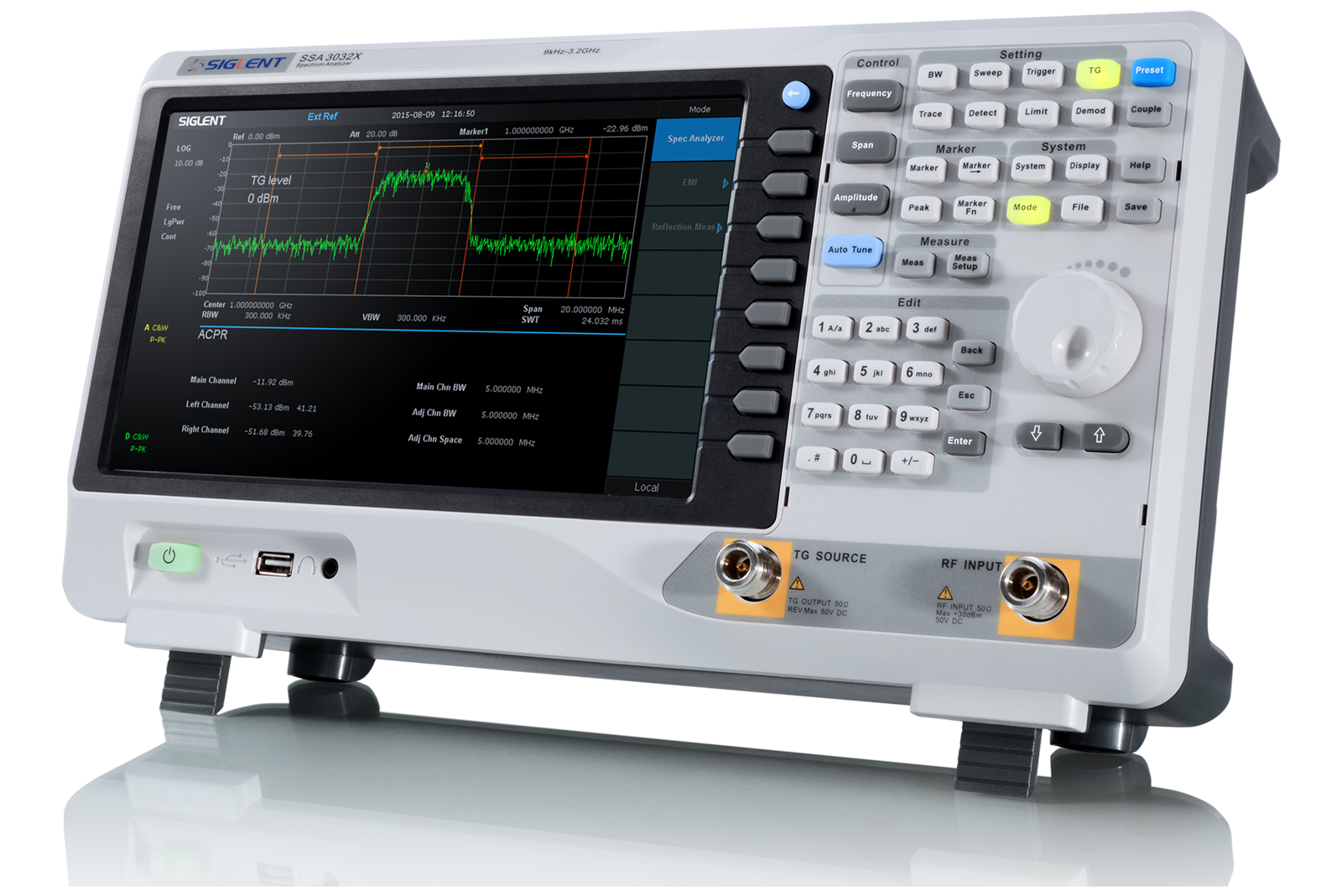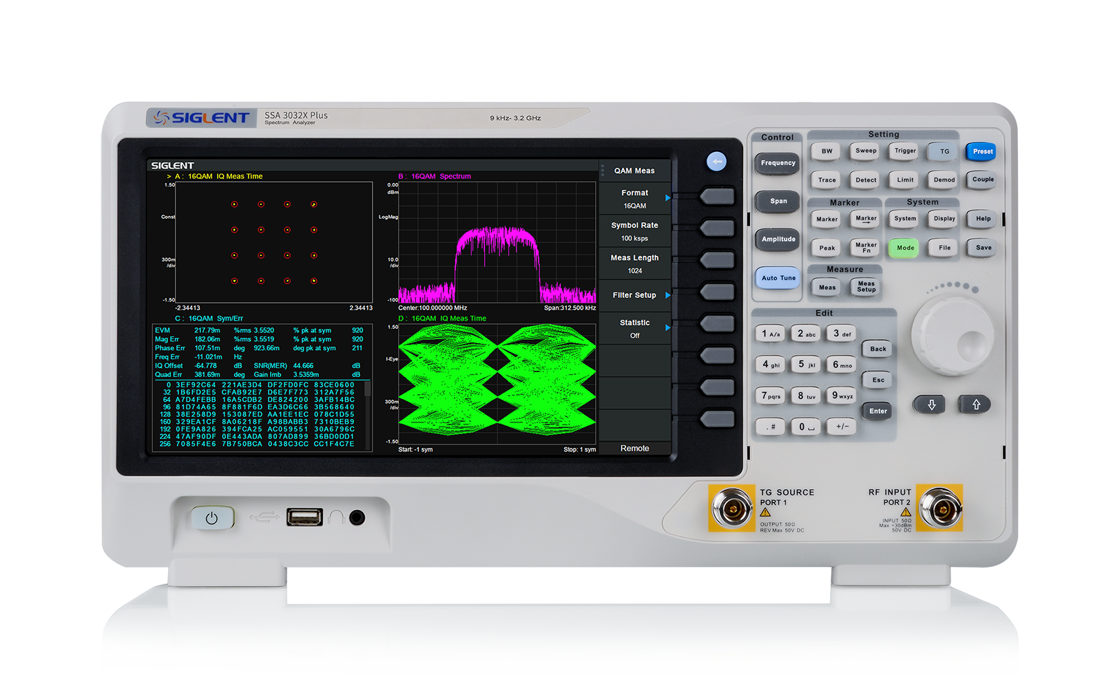 The basic function of the Siglent SSA3032X PLUS Spectrum analyzer and options include RF power measurement, vector signal modulation analysis, reflection measurement, and EMI testing. Applications include broadcast monitoring/evaluation, site surveying, S-parameter measurement, analog/digital modulation analysis, EMI pre-compliance test, research and development, education, production, and maintenance.
