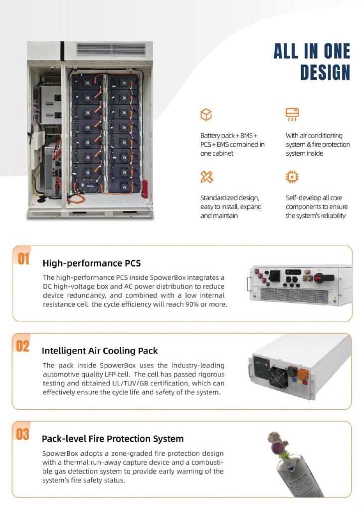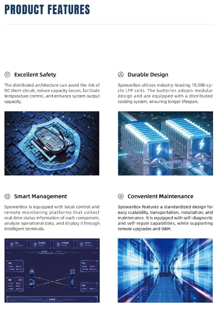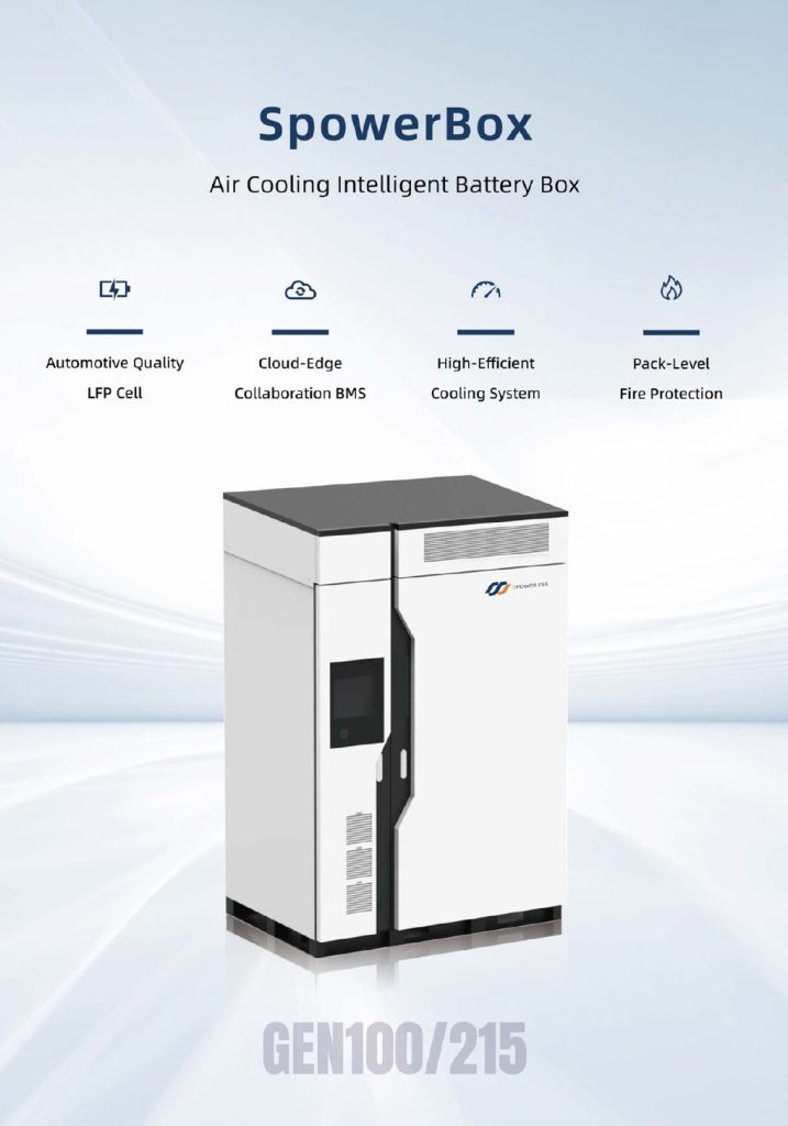SPowerBox-AC air cooling Intelligent battery box is suitable for various industrial and commercial application scenarios such as industrial parks and commercial complexes. Featuring an integrated design, it comes with a built-in intelligent air conditioning system and a pack-level fire protection system. All core components are independently developed, ensuring high system reliability. The standardized design facilitates capacity expansion, equipment transportation, on-site installation, and operational maintenance.